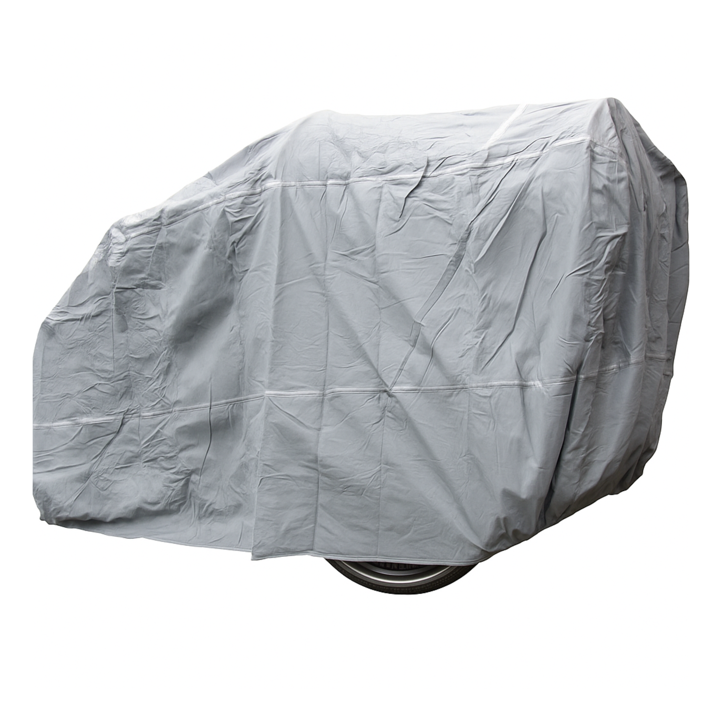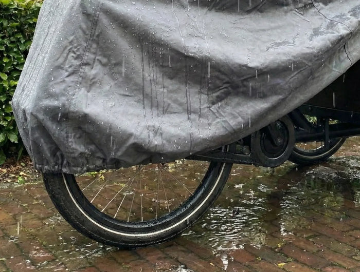 Die graue Hülle besteht aus robustem PVC, verfügt über doppelt vernähte Nähte und eine innere Baumwollschicht, die Kratzer im Lack deines Lastenrads verhindert.